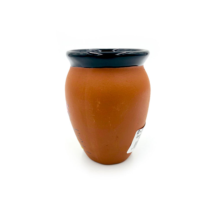 4-Pack Decorative Clay Cup, made of natural clay, hand-painted with designs from the Mexican Bingo- lottery game. Handmade product. Designs may vary. Made in Mexico. Dimensions: 5"x3.5" - Capacity: 500 ml NOT MICROWAVE SAFE