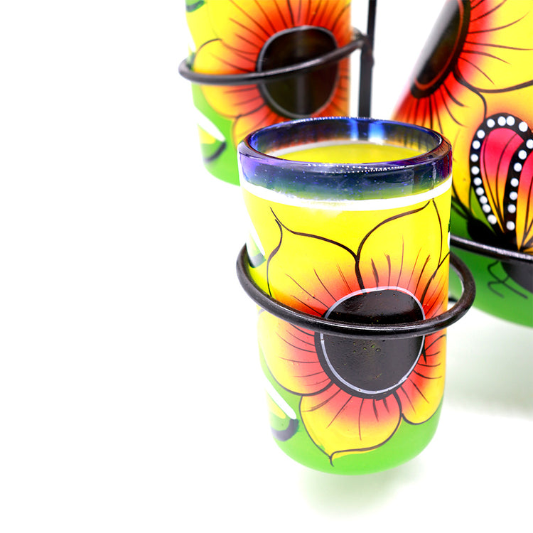 Set of Mexican blown glass pitcher and 6 glasses, hand-painted by skilled craftsmen using techniques passed down from generation to generation. These traditional blue rimmed pitchers show off the iconic Mexican style. Each pitcher and glass is handmade and may vary slightly in size, color, and design. Jug Size: 11"x9". Made in Mexico.