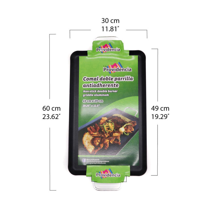 Comal antiadherente de aluminio ideal para preparar alimentos como: tortillas, quesadillas, vegetales, carnes, pescado y mucho más. El revestimiento antiadherente interior garantiza una cocción fácil y una limpieza sencilla. Esta plancha hace que preparar, cocinar y limpiar los platos sea muy fácil. Con asas metálicas en dos lados. Hecho en China. Dimensiones: 49x30x60 cm.